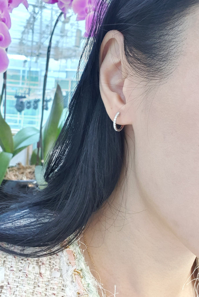 Designed to shimmer from every angle, these 18K white gold diamond huggies are set with diamonds along both the front and back, creating a continuous, effortless sparkle—whether seen head-on or in profile.