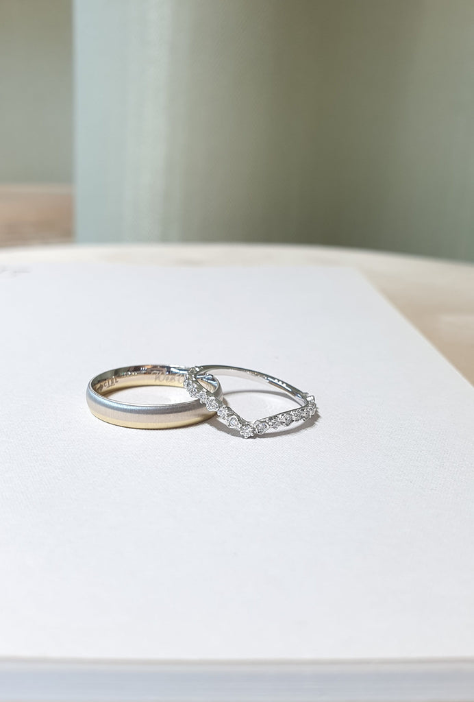For her — A platinum contour band, delicately set with diamonds that catch and reflect light from every angle.